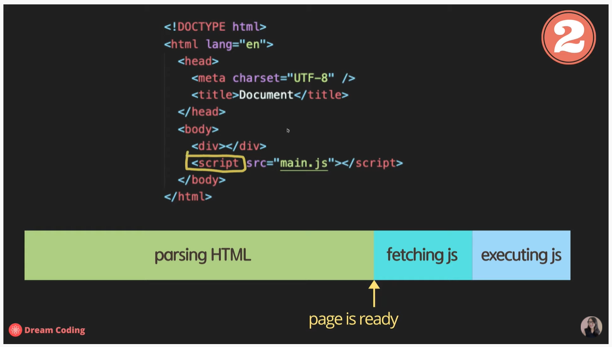 브라우저는 한줄씩파싱하다가 스크립트태그를 만나면 파싱을 멈추고, js다운과 실행이 완료되었을때 페이지를 다시파싱한다.